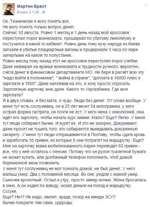 Единственное, что до сих пор не укладывается в моих насквозь ватных мозгах — так это почему мужское население, не желающее идти воевать и вынужденное пускаться в бега, не находит в себе сил, воли и мужества хотя бы попытаться изменить ситуацию здесь, у себя дома, на своей земле. Так же недоступно моему пониманию отсутствие хотя бы каких-либо ответных мер со стороны уже мобилизованных и оказавшихся в чудовищных моральных и бытовых условиях призывников. С учетом того, какое количество буйных было на майдане, неужели ни один из них не попал в зону АТО?! Или «вожаками» все способны быть исключительно в тепличных условиях?!