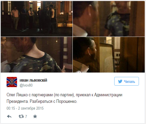 Олег Ляшко: «Депутат от президенской фракции Олег Барна после эфира сломал ребро оппозиционном депутату от Радикальной партии Юрию Чижмарю. Сейчас пытаемся зайти в администрацию президента Порошенко, чтобы встретиться с ним и требовать прекратить нападения и репрессии против оппозиционных народных депутатов».