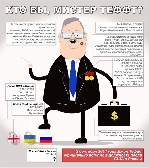 Мнение: На днях руководство одного из российских вузов ответило отказом американскому послу РФ Д.Теффту на его просьбу о встрече со студентами и преподавателями этого учебного заведения. По мотивам угрозы его безопасности. И действительно, судя по его нынешнему беспардонному вранью о «большинстве сирийцев, выступающих против Асада», таких пижонов, выражаясь словами О.Бендера, нужно бить и, возможно, ногами. Теффт – законченный негодяй и американский диверсант, усиленно маскирующийся в овечью шкуру своего дипломатического статуса. Именно он был одним из главных руководителей проамериканского государственного переворота на Украине на завершающем этапе его подготовки. А сейчас этого специалиста по «цветным революциям» с аналогичной миссией забросили в Россию, где он действует точно такими же проверенными на Украине методами. Его повышенное внимание к студенческой аудитории — как раз оттуда. Именно эта масса незрелых детишек и стала ударной силой неонацистского переворота. Помните самый знаменитый вопль евромайдана – «Онижедети!». Очевидно, что точно такую же ставку на политических младенцев США намерены сделать и в России.