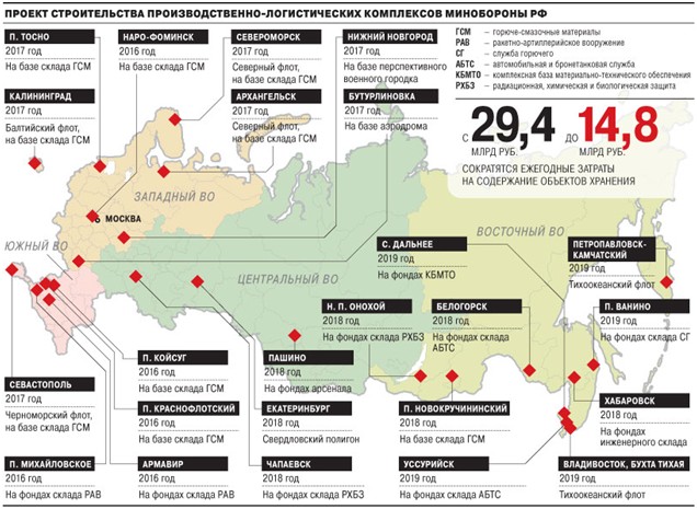 Газета «Коммерсантъ» опубликовала статью Ивана Сафронова «Минобороны меняет склады на комплексы. Военную технику и материалы будут хранить по-новому» о грандиозных планах Министерства обороны России по замене существующих военных складов и баз хранения 24 крупными перевалочно-логистическими комплексами. Они должны заменить существующие сейчас 330 баз и складов на территории России. Военные рассчитывают, что реформа не только упростит логистику, но и приведет к экономии: эксплуатация комплексов оценивается в 14,8 млрд руб. ежегодно, это в два раза меньше, чем стоимость обслуживания существующих сейчас трех сотен объектов. Сейчас в подмосковном Наро-Фоминске строится ПЛК «Нара», который должен будет обеспечивать хранение около 220 тыс. тонн материальных средств и порядка 4700 единиц вооружений и спецтехники.