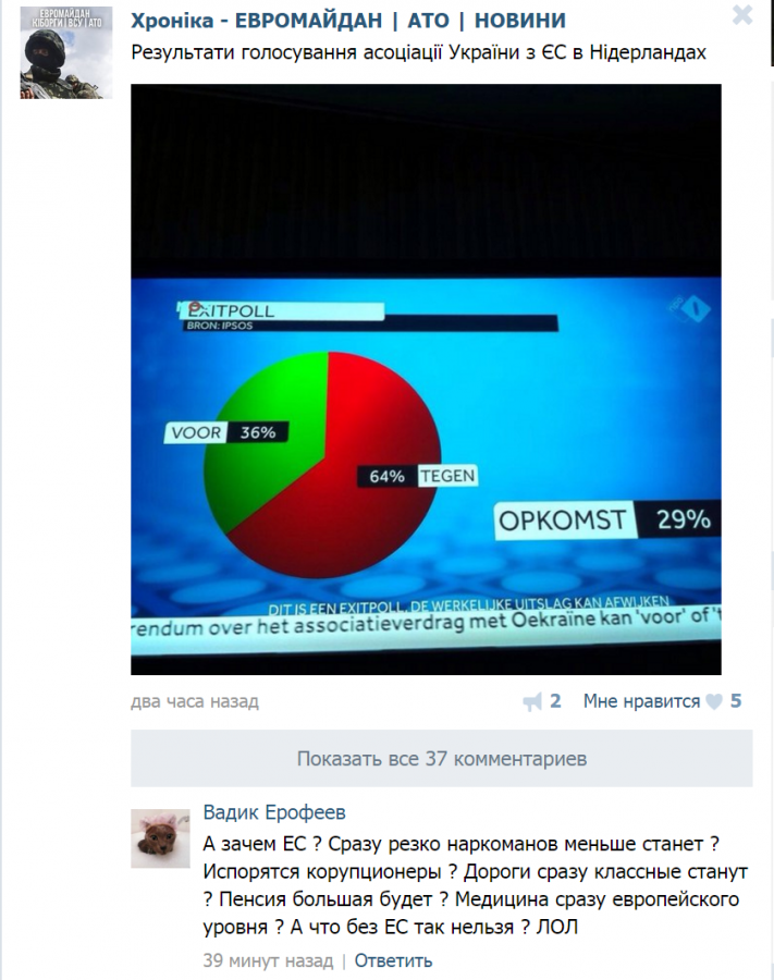 Посты идут в сообществе подряд. Вчера и сегодня, соответственно. Вчера Путин выдумывал фейки о испуганных европейцах, сколько юмора и иронии, сколько разоблачений. А сегодня лаконичное сообщение о результатах референдума. В комментах уже обсуждают, нужна ли им Европа. Завтра они будут верить, что Украина никогда не хотела в Европу, и всегда воевала против неё. И что Украина цэ Япония.