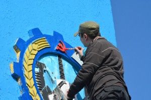 Установив флаг Одессы с имперским гербом города рядом с местом нашей работы, мы приступили к делу. Пока одна часть камрадов занималась очисткой стеллы, другая смешивала краску, раскладывала лестницы, заводила генератор и т.п. Работа по очистке стеллы и её покраске заняла весь день - мы закончили когда солнце уже садилось за горизонт. С особым тщанием мы восстановили старый советский герб Лутугинского района - который укропы тоже перекрасили в свои мерзкие цвета: