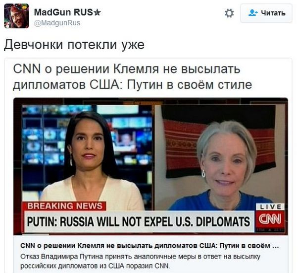 Нервы выдержали не у всех. Так, телекомпания CNN, не дождавшись, соорудила реакцию самостоятельно, распространив дезинформацию о закрытии (в отместку) в Москве школы для детей американских и британских дипломатов.