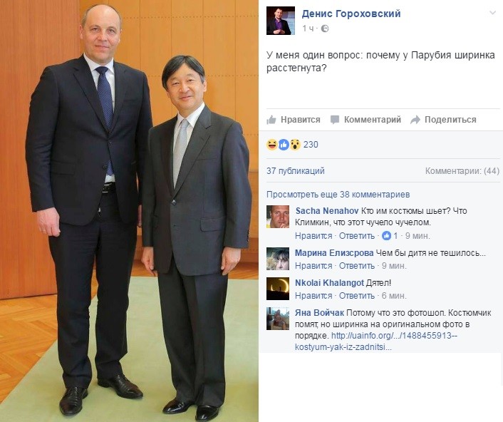 Приключения спикера-логопеда Парубия в Японии превзошли все ожидания от этого визита. До этого момента только украинцы знали, что глава ВР - имбецил и справка у него есть, теперь же о деменции второго человека в Украине знают и все жители страны Восходящего солнца. Ведь на протокольных фотографиях украинский политик предстал в костюме с «плеча Вальцмана», и с расстегнутой ширинкой. То есть, человек элементарно не может уследить за «форточкой» в штанах, но при этом пытается управлять парламентом Цеевропы. Символично, да.