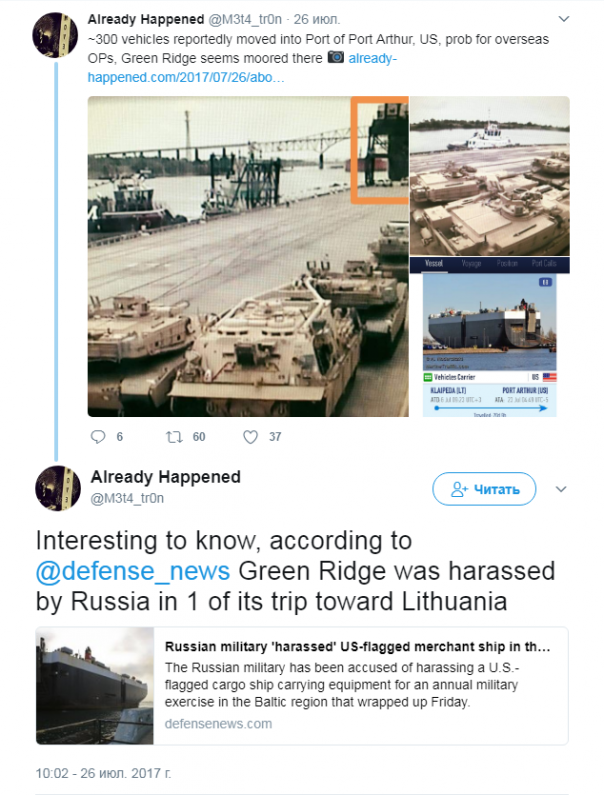 Кроме этого стало известно, что еще два транспортных грузовых корабля ВМФ США на следующей неделе будут загружены танками и бронетехникой, и отправятся в порт Одесса, Украина.