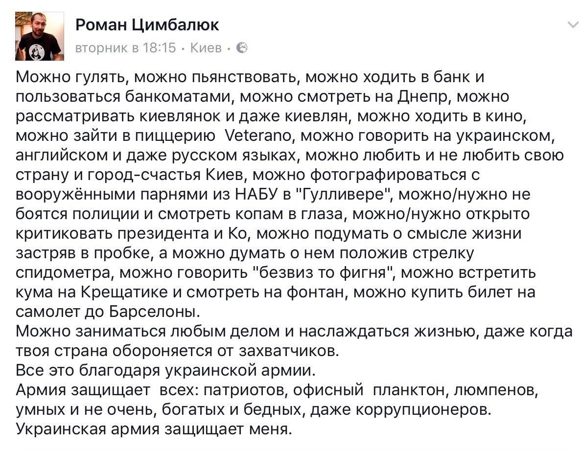 А так, пока эшелоны пушечного мяса регулярно уходят в зону АТО, возвращаясь обратно грузом 200, такие как Цимбалюк получали, получают и будут получать кайф от жизни. Пить, гулять, тратить заработанные пропагандонством деньги, мотаться по безвизу в Барселону и просто жить. Красиво. Полноценно. Со вкусом.