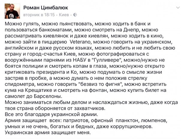 Штатный пропагандон Цимбалюк приехал в Киев. Отдохнуть душой и телом от ненавистного Мордора, в котором, не щадя живота своего ему приходится работать. Ну и делится впечатлениями, расписывая прелести украинского бытия. Итак: