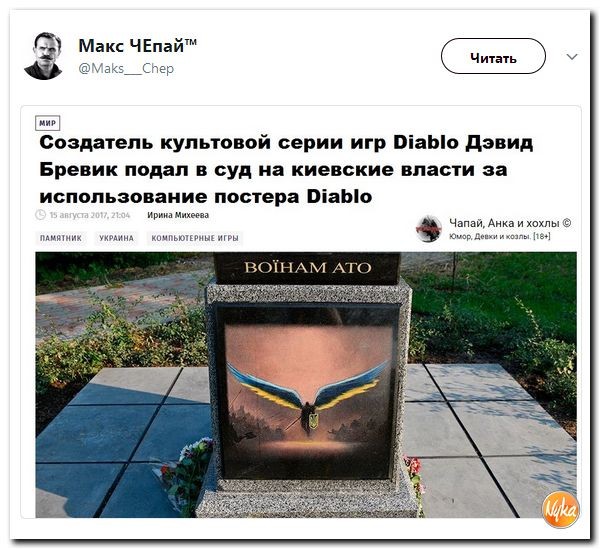 Что касается этой самой картины, то она является банальным плагиатом с рекламного постера компьютерной игры Diablo III. Что же до карты РФ на памятнике, посвященном истории «очень независимой Украины», с самостоятельной культурой и историей, то тут комментарии, как говорится, излишни. И можно вспомнить только, что до стадии отрицания «Украина - не Россия» свидомые граждане дошли, а вот со стадией принятия и определения, если не Россия, то что ж такое Украина - процесс как-то буксует даже на уровне художественных образов.