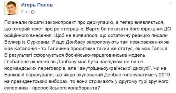 Игорь Попов, депутат Верховной Рады от партии Олега Ляшко, выразил неудовлетворение известием о том, что Петр Порошенко готовится внести в парламент закон «о реинтеграции Донбасса».