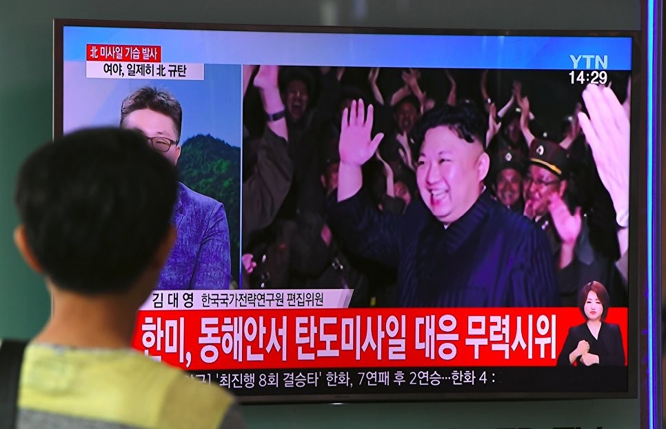 Трансляция новостей про лидера КНДР Ким Чен Ына, который рад успешным испытаниям баллистической ракеты КНДР в Сеуле. Архивное фото