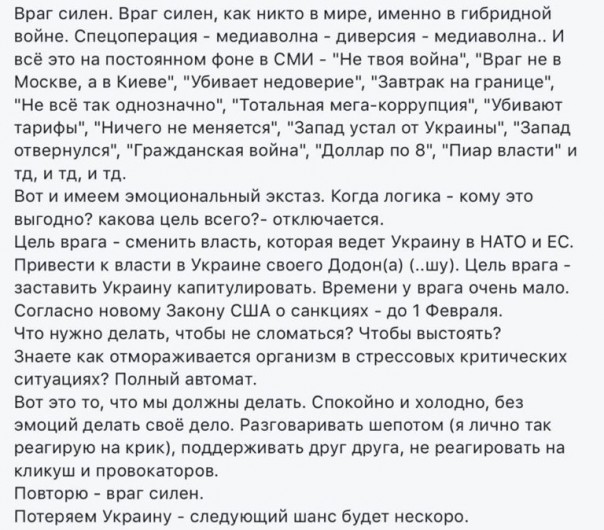 Ответ на вопрос «зачем это нужно России?!» прост до неприличия. Потому что выборы. У Путина. Которые, он, бедолага, без дестабилизации ситуации в/на точно не выиграет. Тот факт, что большинство россиян новости из Украины, не связанные с Донбассом, читает исключительно, чтоб поржать — кастрюлеголовые не учитывают. И уж тем более простому рагулю, четвёртый год потребляющему информационное ГМО от укрСМИ, невдомёк, что россияне проголосуют за Путина не за «взорванный лично им» склад на Украине, а за совершенно другие свершения и перспективы.
