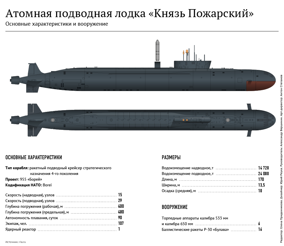 "Бореи" с морскими твердотопливными ракетными комплексами "Булава" встают на вооружение Северного и Тихоокеанского флотов. Один такой крейсер несет 16 ракет. Именно "Бореи" в ближайшей перспективе составят основу группировки стратегических ядерных сил ВМФ России. В период до 2020 года флот должен получить восемь лодок этого проекта, при этом строительство стратегических субмарин пятого поколения планируется начать после 2025 года.