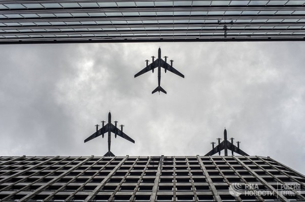 Стратегические бомбардировщики-ракетоносцы Ту-95 МС на тренировке групп парадного строя авиации к Параду Победы