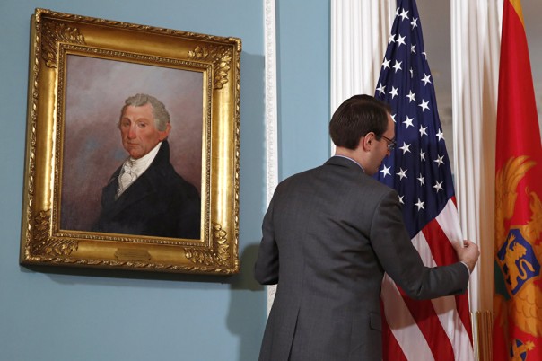 Сотрудник поправляет флаг в здании Госдепартамента США перед встречей Рекса Тиллерсона