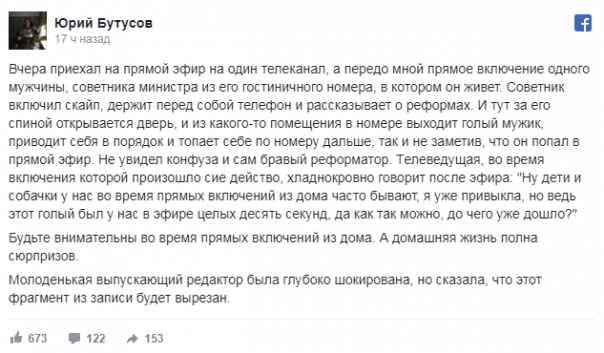 Главред «Цензор.нет» Бутусов возмутился разгулу гомосексуализма вна Украине. С его слов, неназванный советник украинского министра, был на прямом включении в эфире одного из телеканалов, когда за его спиной появился обнаженный мужчина. Упсс