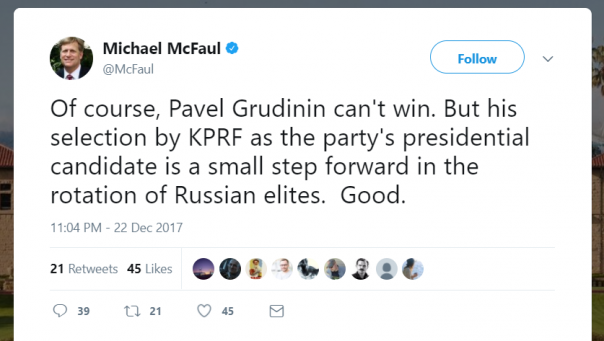 "Конечно, Павел Грудинин не может победить. Но то что КПРФ его выбрала как партийного президентского кандидата - это маленький шаг вперед в ротации российских элит. Хорошо."