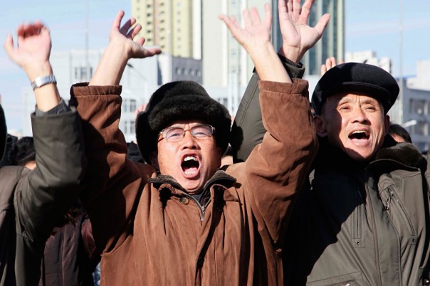 Люди приветствуют сообщение о пуске баллистической ракеты Хвансон-15 в Пхеньяне