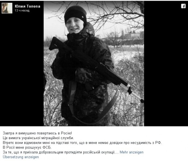 В РФ участница антитеррористической операции на Донбассе Юлия Толопа, которая добровольно приехала из России участвовать в боевых действиях на Донбассе, объявлена в розыск, об этом она сообщила в facebook.