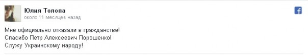 “Завтра я вынужденно возвращаюсь в Россию! Это требование украинской миграционной службы. В третий раз они отказали мне на основании того, что у меня нет справки о несудимости из РФ.”, – пишет Толопа.