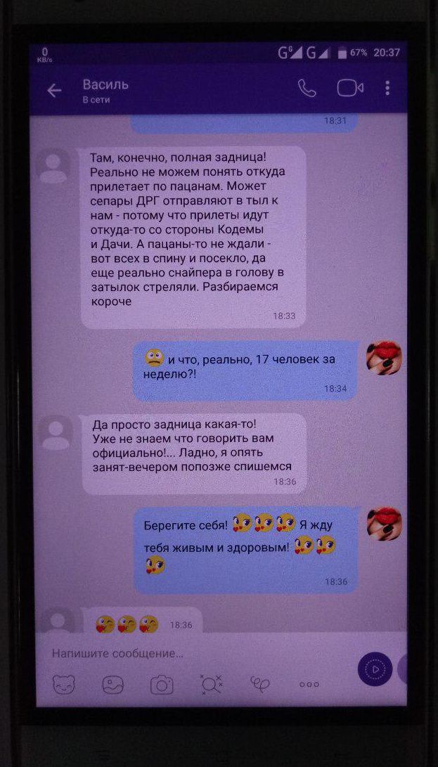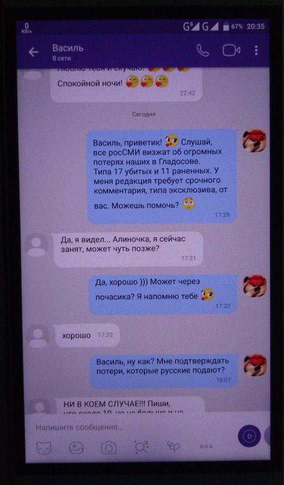 Переписка журналистки «РБК-Усраина» с офицером пресс-центра штаба «АТО» Василием Лабаем, подтверждающая большие потери укрофашистов