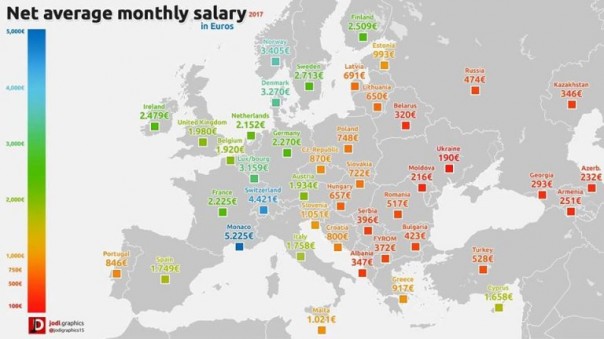 На другом полюсе — бедные страны Европы. Так, средняя зарплата у ближайших соседей Украины молдаван составляет 216 евро, средняя зарплата в РФ 474 евро, в Беларуси 320 евро. В этой группе стран наиболее благополучными по показателю средней зарплаты выглядят поляки с 746 евро в месяц на работающего.