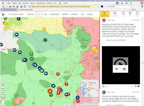 Тактическая ситуация на границе Алеппо и Идлиба на 29.01.18. Светло-зелёный участок — территория, подконтрольная «ан-Нусре» и иным террористическим группировкам, жёлтый — южный сектор кантона Африн, красный — территории, освобождённые Сирийской Арабской Армией. Синие «маркеры» отображают места прохождения турецкого конвоя (наблюдается полное согласование действий ВС Турции с террористами из «Тахрир аш-Шам»), красные «маркеры» — точки нанесения ответных артиллерийских ударов САА по террористам и содействующему конвою