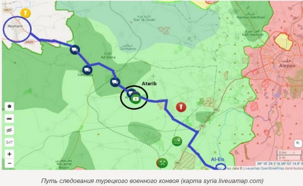 Ярким тому доказательством являются небезынтересные события, которые происходят на протяжении последней недели января в северной и западной частях «Идлибского гадюшника», разделённого на сектора контроля «Джебхат ан-Нусры» («Хайят Тахрир аш-Шам»), разрозненных группировок вооружённой «умеренной оппозиции», а также протурецкого «костяка» FSA (ССА). Около недели назад, по информации онлайн-карты syria.liveuamap.com, а также некоторых курдских и оппозиционных ресурсов, на территорию провинции Идлиб вошёл огромный военный конвой турецкой армии, в составе которой были бронеавтомобили KIRPI (4х4), БТР и боевые машины пехоты с более чем сотней пехотинцев. Колонна проследовала от турецкого КПП «Рейханли» (провинция Хатай) в направлении города Эль-Эйс, расположенного близ подконтрольного Сирийской Арабской Армии города Хадер (у линии фронта).