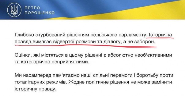 Так он прокомментировал сегодняшние слова президента Украины Петра Порошенко, заявившего, что «историческая правда требует откровенного разговора и диалога, а не запретов».