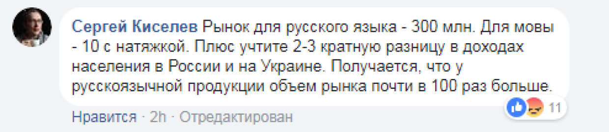 «Рынок для русского языка — 300 миллионов. Для «мовы» — 10 с натяжкой. Плюс учтите 2–3 кратную разницу в доходах населения в России и на Украине. Получается, что у русскоязычной продукции объем рынка почти в 100 раз больше», — пишет Сергей Киселев.