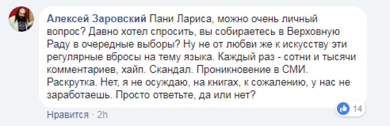 «Пани Лариса, можно очень личный вопрос? Давно хотел спросить, вы собираетесь в Верховную Раду в очередные выборы? Ну не от любви же к искусству эти регулярные вбросы на тему языка. Каждый раз — сотни и тысячи комментариев, хайп. Скандал. Проникновение в СМИ. Раскрутка. Нет, я не осуждаю, на книгах, к сожалению, у нас не заработаешь. Просто ответьте, да или нет?» — спрашивает Алексей Заровский.