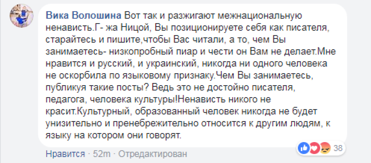«Вот так и разжигают межнациональную ненависть. Г-жа Ницой, вы позиционируете себя как писателя, старайтесь и пишите, чтобы вас читали, а то, чем вы занимаетесь — низкопробный пиар и чести он вам не делает. Мне нравится русский и украинский, никогда ни одного человека не оскорбила по языковому признаку. Чем вы занимаетесь, публикуя такие посты? Ведь это не достойно писателя, педагога, человека культуры! Ненависть никого не красит. Культурный, образованный человек никогда не будет унизительно и пренебрежительно относится к другим людям, к языку на котором они говорят», — отмечает Вика Волошина.