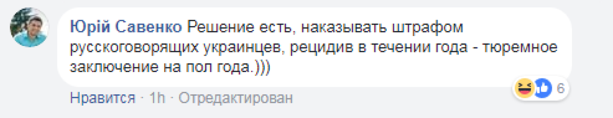 «Решение есть, наказывать штрафом русскоговорящих украинцев, рецидив в течение года — тюремное заключение на полгода», — предлагает Юрий Савенко.