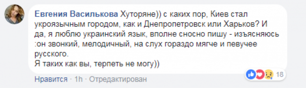 «С каких пор, Киев стал украиноязычным городом, как и Днепропетровск или Харьков? И да, я люблю украинский язык, вполне сносно пишу — изъясняюсь: он звонкий, мелодичный, на слух гораздо мягче и певучее русского. Я таких как вы терпеть не могу», — Евгения Василькова.