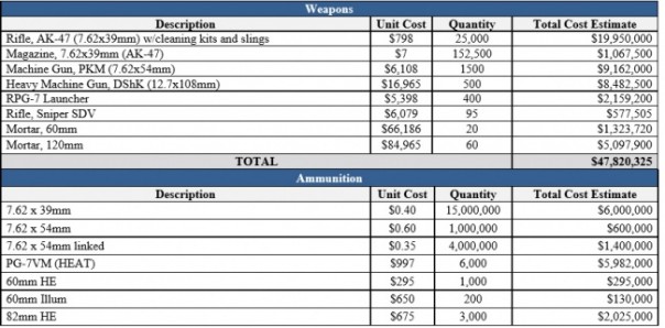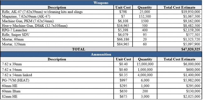На поддержку сирийских боевиков по программе финансирования подготовки и вооружения сил для противостояния запрещенному в России «Исламскому государству» Пентагон попросил выделить из бюджета на этот и следующий годы $ 800 млн $ 114 млн из них планируется направить на закупку 62 тыс. автоматов АК-47, 7,5 тыс. модернизированных пулеметов Калашникова (ПКМ), 3,5 тыс. крупнокалиберных пулеметов ДШК, 3,4 тыс. ручных противотанковых гранатометов РПГ-7 и 744 снайперские винтовки Драгунова.