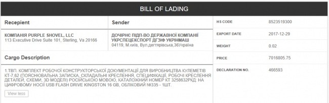 Судя по документам, американские компании отреагировали на предложение. Так, в базе данных международного сайта таможенных деклараций Importgenius, есть акт отгрузки, по которому дочка украинской госкомпании «Укрспецэкспорт», «Укринмаш», продала американской Purple Shovel комплект рабочей конструкторской документации для производства пулеметов КТ-7,62 за 7 млн грн ($ 267 тыс.). Комплект из пояснительной записки, сборочных чертежей, спецификаций, рабочих чертежей деталей, схем и 3D моделей передали американцам на «флэшке» 29 декабря прошлого года.