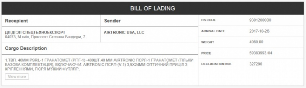 Например, 27 октября в страну доставили 400 ручных противотанковых гранатометов PSRL-1. На специализированном бизнес-портале Importgenius есть акт отгрузки вооружений от американской компании Airtronic. Получатель — украинская госкомпания «Укрспецэкспорт». В документе говорится, что на Украину доставили гранатометы в базовой комплектации с оптическими прицелами общим весом 4 тонны. Стоимость одного РПГ составила 148 тыс. грн ($ 5,5 тыс.).