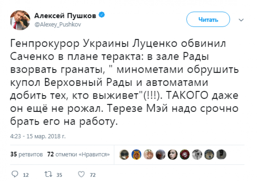 Алексей Пушков, председатель комиссии Совета Федерации России по информационной политике, высказал свое мнение о заявлении генерального прокурора Украины. На личной странице в социальной сети Twitter Пушков заявил, что Луценко нужно срочно взять на работу к Терезе Мэй.
