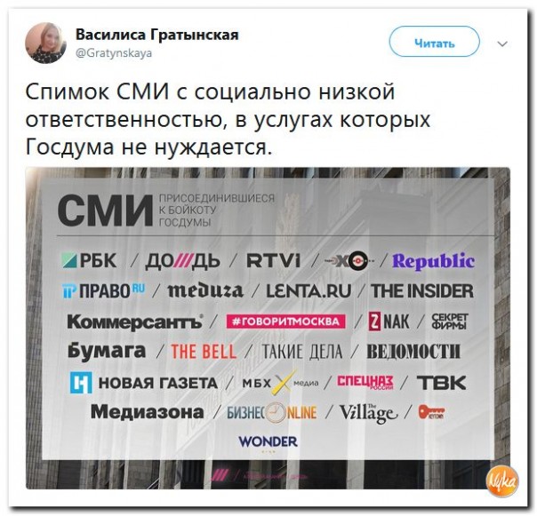 Потренировавшись на Трампе, который теперь без оглядки на фейк-ньюс чихнуть боится, представители этой профессии решили, что в России у них этот номер тоже прокатит. Они решили, что почту и телеграф они уже взяли, пора брать Госдуму, а там и выше пора будет замахнуться.