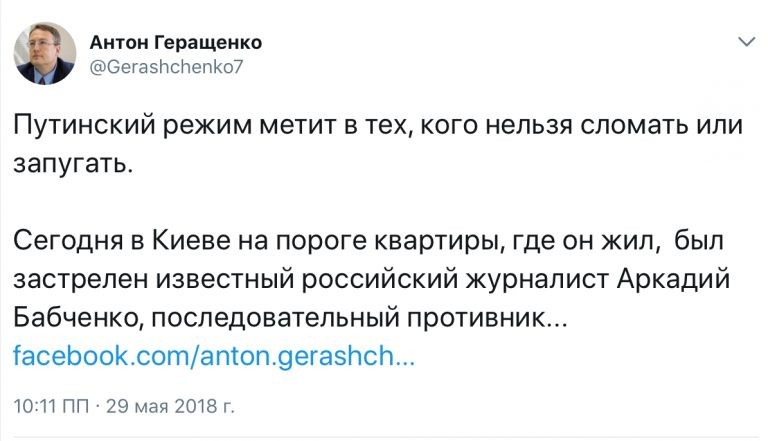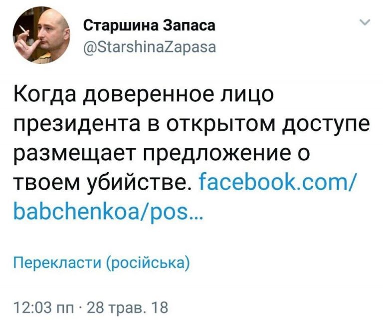 С убитой в прифронтовой зоне девочкой не вышло. Ее мать сказала, что это сделали ВСУ. Срочно нужна была замена. А тут как раз Бабченко написал пост, что ему угрожает доверенное лицо Путина. Правда, угрожали аж в 2014-м, причём, «угроза» выражалась в предложении пригласить «журналиста», снимавшего репортажи про ВСУ в АТО попить чаю с Кадыровым.
