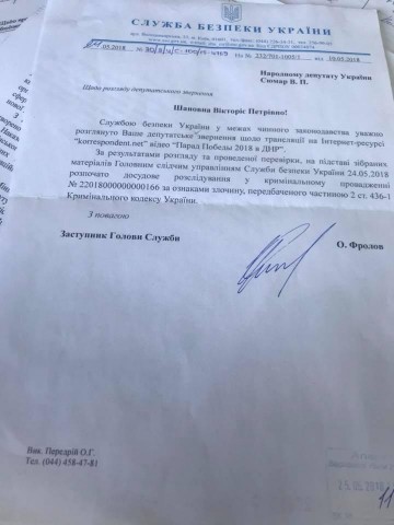 «Службой безопасности Украины в рамках действующего законодательства внимательно рассмотрено Ваше депутатское обращение касаемо трансляции на интернет-ресурсе «Korrespondent.net» видео «Парад Победы 2018 в ДНР».