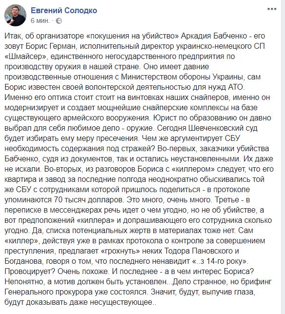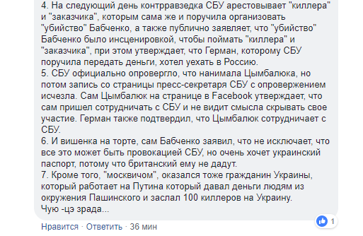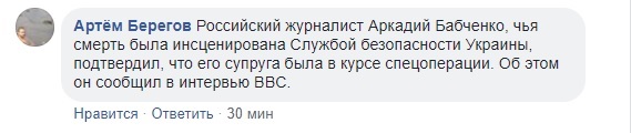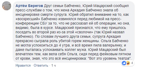 Прямо сейчас Бабченко даёт интервью иностранной прессе, которая в ах.. в шоке. Режиссёр шапито решил, что это лучший способ смахнуть говно под стол. Но, поскольку всё делается в спешке, правдоподобное враньё придумать не смогли. Помните, как на брифинге, посвященном воскрешению ("Бабченко в студию!" Я думала, что его вынесут в чёрном ящике), Аркадий просил прощения у своей жены: "Ольга, дорогая, прости. Но так было надо"?