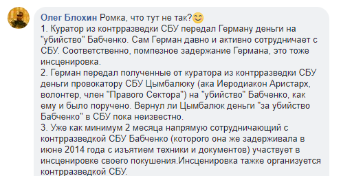 Как сообщалось, вечером 29 мая сначала СМИ, затем и власти Украины сообщили, что российского журналиста Аркадия Бабченко, который с 2017 года работал на телеканале ATR в Киеве, якобы застрелили на лестничной клетке его дома в столице Украины. На следующий день, 30 мая, во время брифинга в пресс-центре СБУ глава спецслужбы Василий Грицак заявил, что информация о «убийстве» Бабченко была частью спецоперации украинских правоохранителей, направленной на предотвращение покушения на журналиста и еще 30 человек. После этого сам воскресший блогер вышел к собравшимся на брифинг представителей СМИ и сообщил некоторые подробности проведенной спецоперации. Источник