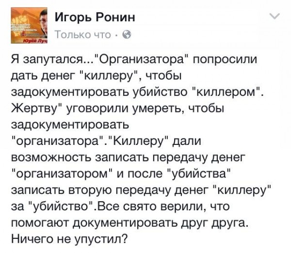 По его словам, когда выяснилось, что убийства не было и журналист жив, они начинают высказывать беспокойство, опять-таки, действиями украинской власти, забыв прокомментировать действия страны, которая послала этих убийц к нам, финансируют их и ждут эти сообщения».