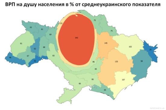 По состоянию на 1 апреля 52% всех прямых иностранных инвестиций было сосредоточено в Киеве, и еще 5% в Киевской области. На начало лета в столице было зарегистрировано 30% всех юрлиц страны (и еще 5% в области). Для сравнения. В следующей за столицей Днепропетровской области сосредоточено всего 7,6% предприятий.