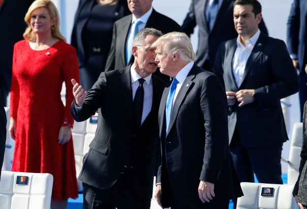 Генсек НАТО Йенс Столтенберг и президент США Дональд Трамп (слева направо на первом плане) на церемонии открытия саммита НАТО в Брюсселе, 25 мая 2017