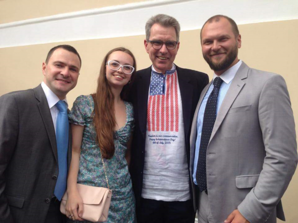 На втором фото - предыдущий посол США Джеффри Пайетт в подаренной ему на день независимости США вышиванке в форме американского флага