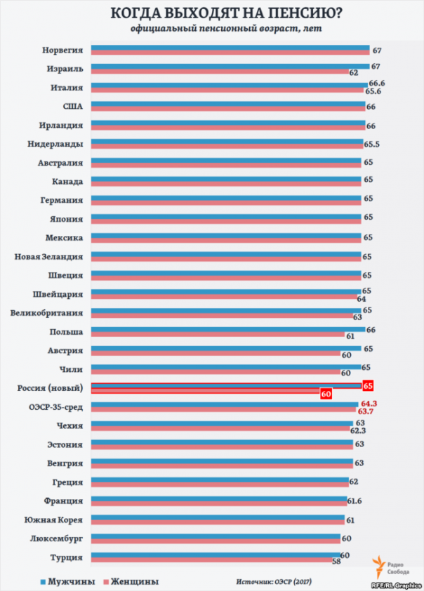 «Среди 35 наиболее индустриально развитых стран мира, входящих в Организацию экономического сотрудничества и развития (ОЭСР), в девяти сохраняется пока разный возраст выхода на пенсию для мужчин и женщин. А для всех стран организации в среднем, по оценкам самой ОЭСР, стандартный пенсионный возраст для мужчин составляет 64,3 года, для женщин – 63,7 года.