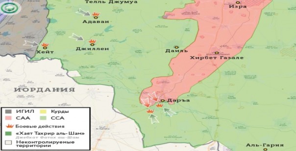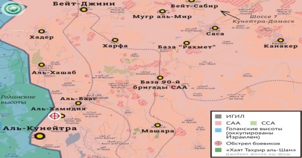 Кунейтра. В населенных пунктах Аль-Маалака (Al-Maalaqah) и Джабата-аль-Хашаб (Jabata Al-Khashab) бойцами Сирийской арабской армии обнаружены ещё два крупных склада оружия, оставленного боевиками, передавал военный источник на своей странице в социальной сети Twitter (@SyriawatanNews). Автор публикации отмечал, что в схроне радикальных исламистов были также найдены медикаменты производства Израиля.