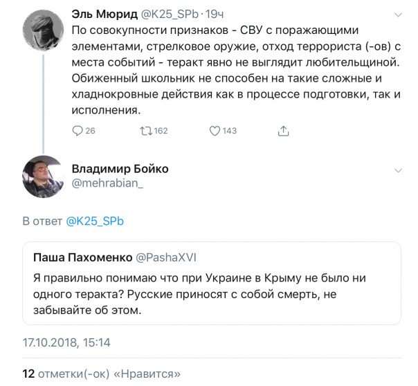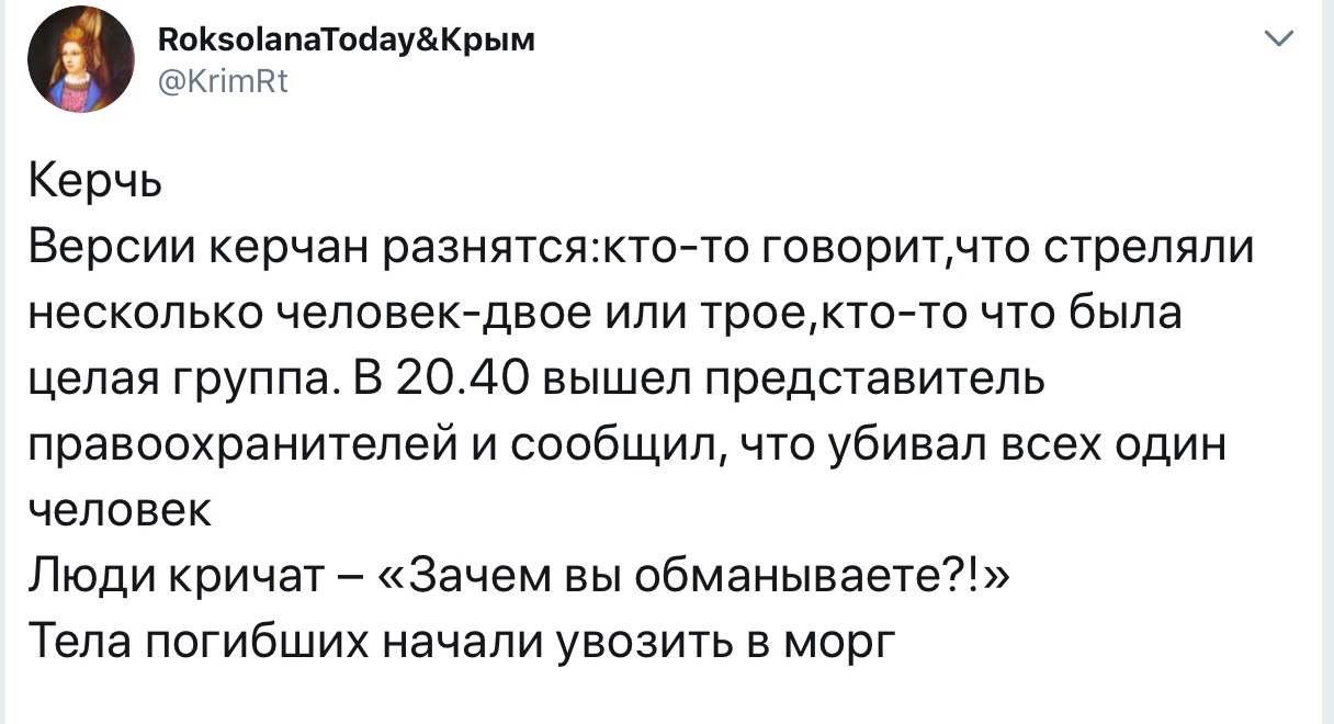 Но дело даже не в этом. Коллективный вой «при Украине такого не было» имеет под собой конкретную цель. Равно, как и непрекращающиеся попытки доказать, что орудовал не съехавший с катушек 18-летний парень, а целая группа автоматчиков. Налицо «Зимняя вишня-2». С той лишь разницей, что, помимо уже привычного для таких событий нагнетания истерики, в Крыму хотят спровоцировать людей на массовые волнения и пытаются отыграть на этом потерянное в марте 2014-го.