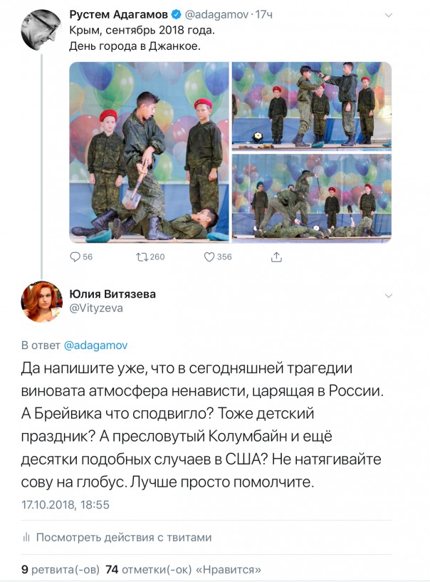 Предчувствия меня не обманули. Уже в первые часы после случившегося сеть накрыла истерика под лозунгом «Русский мир убивает». Каждый шумер и светлолицый комментатор считал своим долгом выложить фото из Артека, где дети стреляют по мишеням и фото, снятое в Джанкое на празднике.